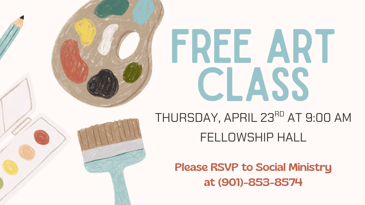 All are welcome to the free art class on Thursday, April 23rd at 9:00 AM in Fellowship Hall. Whether you majored in art or have never touched a paint brush, this class is for everyone! Everything will be provided, so please call Social Ministry to RSVP at (901)-853-8574.