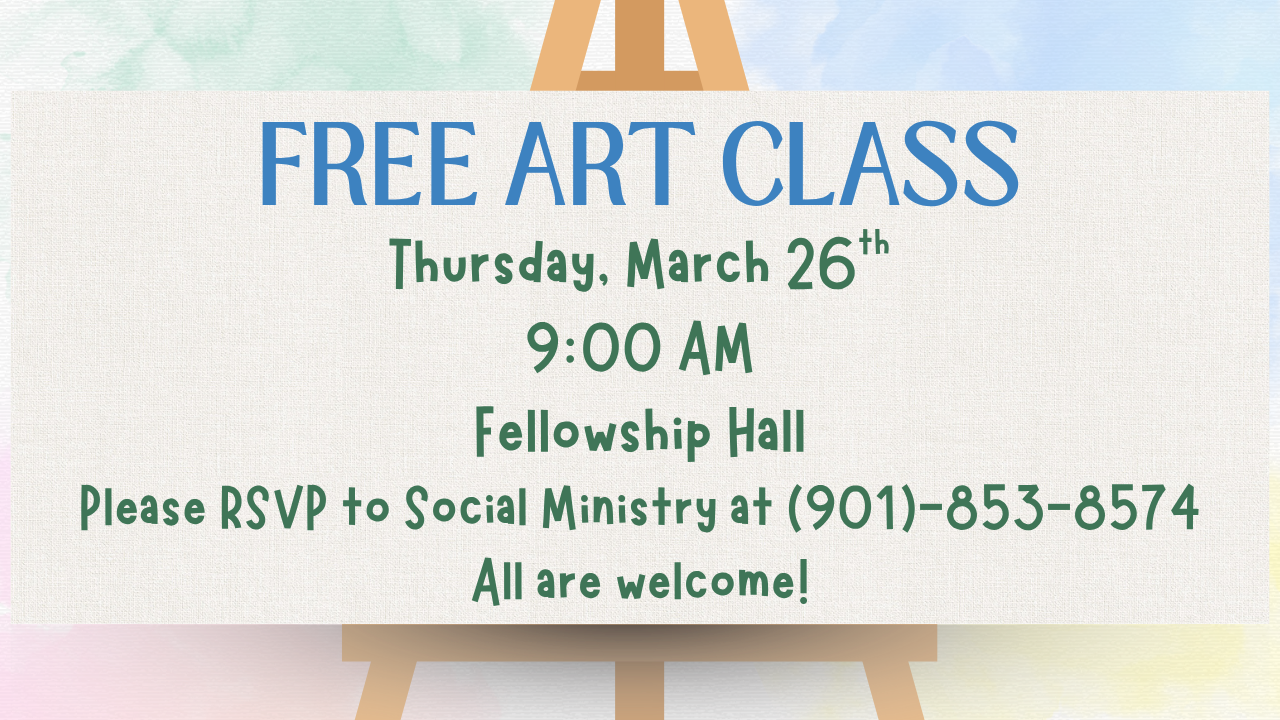 All are welcome to the free art class on Thursday, March 26th at 9:00 AM in Fellowship Hall. Whether you majored in art or have never touched a paint brush, this class is for everyone! Everything will be provided, so please call Social Ministry to RSVP at (901)-853-8574.