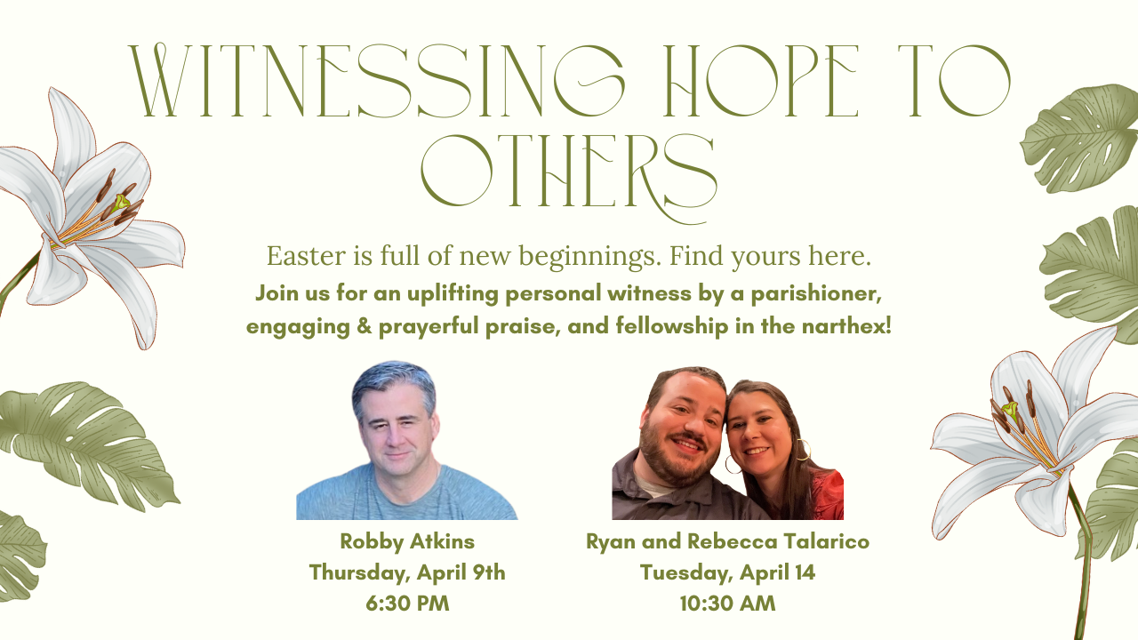 🤲 Join us on Thursday, April 9th at 6:30 PM and Tuesday, April 14th at 10:30 AM for an uplifting personal witness of hope, engaging & prayerful praise, and fellowship in the narthex!